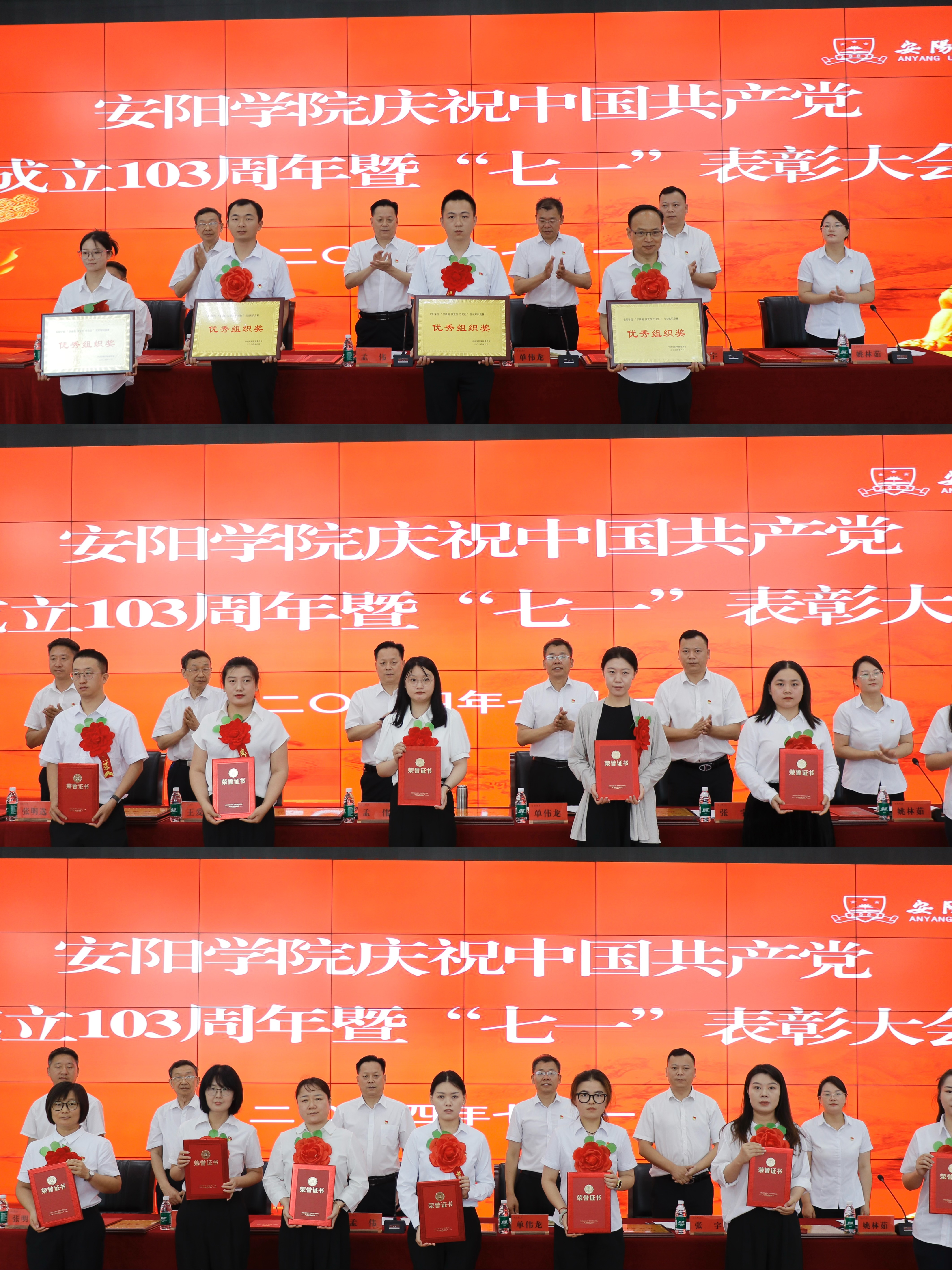 7月1日上午,我校庆祝中国共产党成立103周年暨“七一”表彰大会在综合楼学术报告厅隆重举行。党委书记孟伟,党委副书记、校长单伟龙,副校长王爱民,副校长、工会主席张明选,纪委书记、校长助理姚林茹出席大会,副校长马保建、柴兴泉、王国强在原阳校区分会场出席大会,会议由党委副书记、副校长张宇主持。学校各党政部门负责同志,各二级院部党政领导班子成员,受表彰的单位和个人以及各基层党员代表参加了会议。