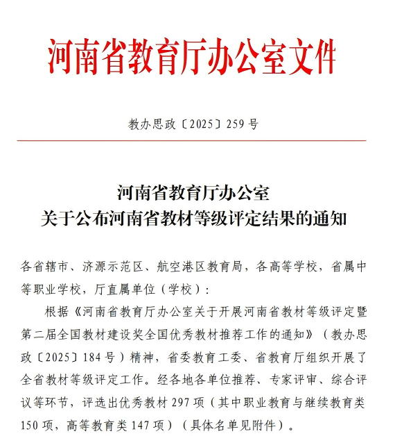 近日,河南省教育厅办公室正式公布《关于公布河南省教材等级评定结果的通知》(教办思政〔2025〕259号),我校推荐申报的《计算机应用基础(第6版)》荣获河南省教材等级评定二等奖,成为我校建校以来首次斩获该类奖项的标志性成果,为学校高质量发展注入新动能,实现了学校在省级优质教材评选中的“零突破”,标志着学校教材建设水平迈上新台阶。