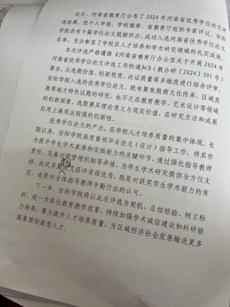 近日,河南省教育厅公布了2024年河南省优秀学位论文评选结果。经个人申报、学校推荐、省教育厅组织专家评议,安阳学院共有9篇学位论文脱颖而出,成功入选河南省优秀学位论文名单,充分彰显了学校在人才培养和学术研究领域的扎实成效。