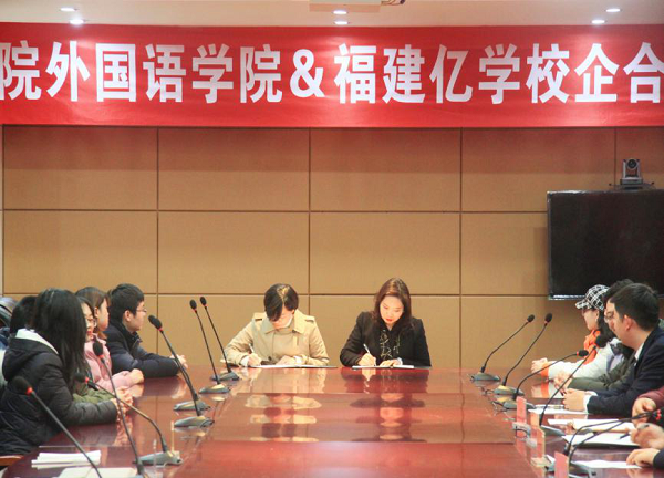 为培养应用型人才,使教育与社会经济发展相结合,增强学校发展的后劲与活力的同时使专业与产业、企业、岗位对接,实现双方资源共享、优势互补、合作共赢,12月25日,我校与福建亿学教育科技集团有限公司举行“校外实习实训基地”签约暨揭牌仪式。亿学教育科技集团总经理许艳玉,我校副校长、纪委书记王爱民,外国语学院副院长任志芬出席此次仪式。仪式由外国语学院教师张强主持。