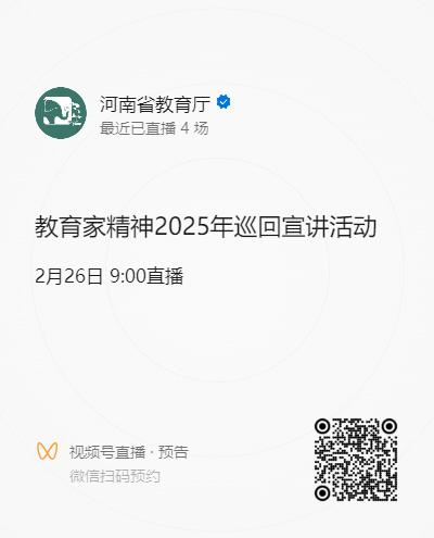 1.本次宣讲活动将通过“河南省教育厅”微信视频号线上直播,各单位可通过附件中二维码进行预约观看。