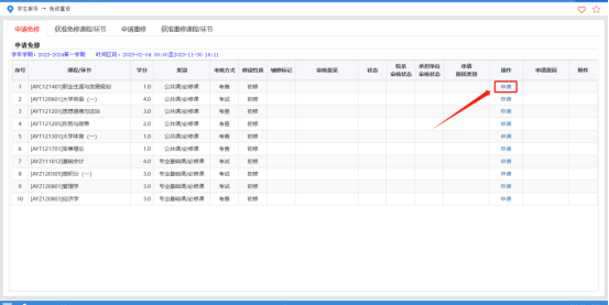 2.点击“申请免修”,选择课程后的“申请”(操作步骤,如下所示)。