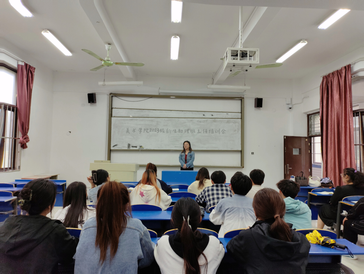 为确保2023级新生报到期间各项工作有序进行,更好地培养一支有格局、有担当、有思想的辅导员助理队伍,从而带动新生更好、更快地熟悉大学生活。美术学院于8月27日在教学楼A4-102召开2023级新生助理班主任培训会,美术学院党总支副书记李怡彤,全体新生思政辅导员老师、新生助理班主任参加会议。