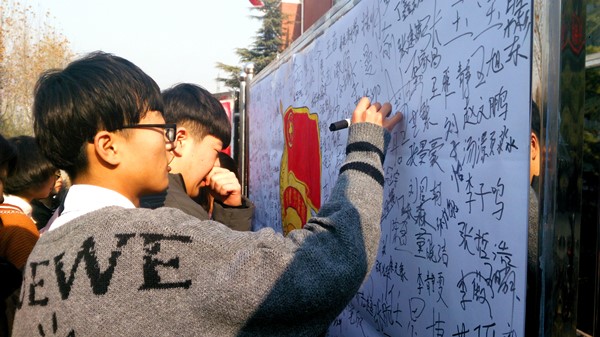 12月7日,我院学生会宣传部推出的“铭记历史”宣传板面在喷泉餐厅展出,吸引了广大同学的关注,我院学生担任解说员为到场参观的同学们讲解“一二·九”运动的历史,随后,同学们积极互动,以签名和写爱国寄语的形式在宣传板上留下了自己的印记,意义在于将“一二·九”的爱国主义精神更好地传承下去。12月8日,我院学生会全体成员在新操场举行了“传承爱国情,长立报国志”爱国宣誓活动,庄严的誓词使同学们坚定了理想信念。12月9日,我院录制的《纪念一二·九运动》访谈微视频正式发布,该视频通过“谈谈你对一二·九的认识”和“作为新时代的青年我们应该做些什么”这两个问题对我院学生进行了访谈,视频中同学们的发言起到了良好的引导作用。
