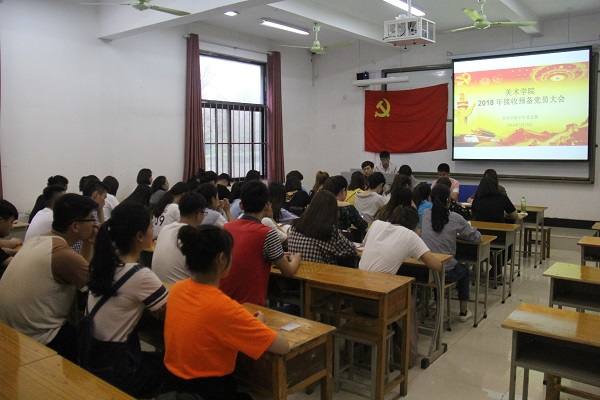 为贯彻落实党的十九大会议精神,加强基层党组织建设,严格落实“三会一课”制度,2018年5月14日晚,美术学院学生党支部在教学楼A4-103召开了2018年接收预备党员大会。会议由美术学院学生党支部书记牛阳主持,美术学院党总支副书记王振、宣传委员田原、思政辅导员田鸿彬以及学生党支部主要成员参加会议。