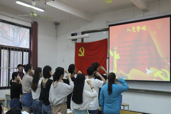 大会在庄严的《国际歌》中拉开帷幕,鲍怀更、李羚方等10名党员发展对象依次发言,向党组织汇报自己近一年来的思想情况和现实表现,表达入党志愿。作为他们的入党介绍人和培养人,田原和田鸿彬两位同志分别对10名党员发展对象近一年的表现给予评价,就是否同意推荐他们加入中国共产党表明意见。牛书记代表支部委员会报告对发展对象的审查情况;参会正式党员举手表决,一致同意以上10名党员发展对象加入中国共产党。接着,正式党员代表边继鹏带领10名预备党员进行了庄严的入党宣誓。王书记对党组织注入新鲜血液表示祝贺,同时对大家提出了三点要求:一是牢固树立“四个意识”,尤其要加强政治意识;二是加强理论学习,用习近平新时代中国特色社会主义思想武装头脑;三是在学习、生活和工作中,践行“三严三实”的基本要求。