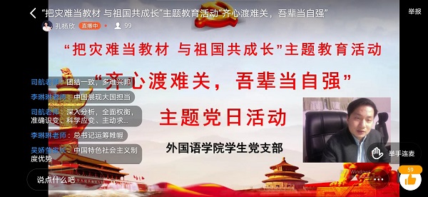 为激发学生党员爱党爱国爱社会主义的巨大热情,深刻认识到时代使命和责任担当,增强思想自觉、政治自觉、行动自觉,4月10日,外国语学院学生党支部开展“把灾难当教材 与祖国共成长”主题教育活动之“齐心渡难关,吾辈当自强”主题党日活动。党总支副书记李伟荣、学生党支部书记张璐出席本次活动。
