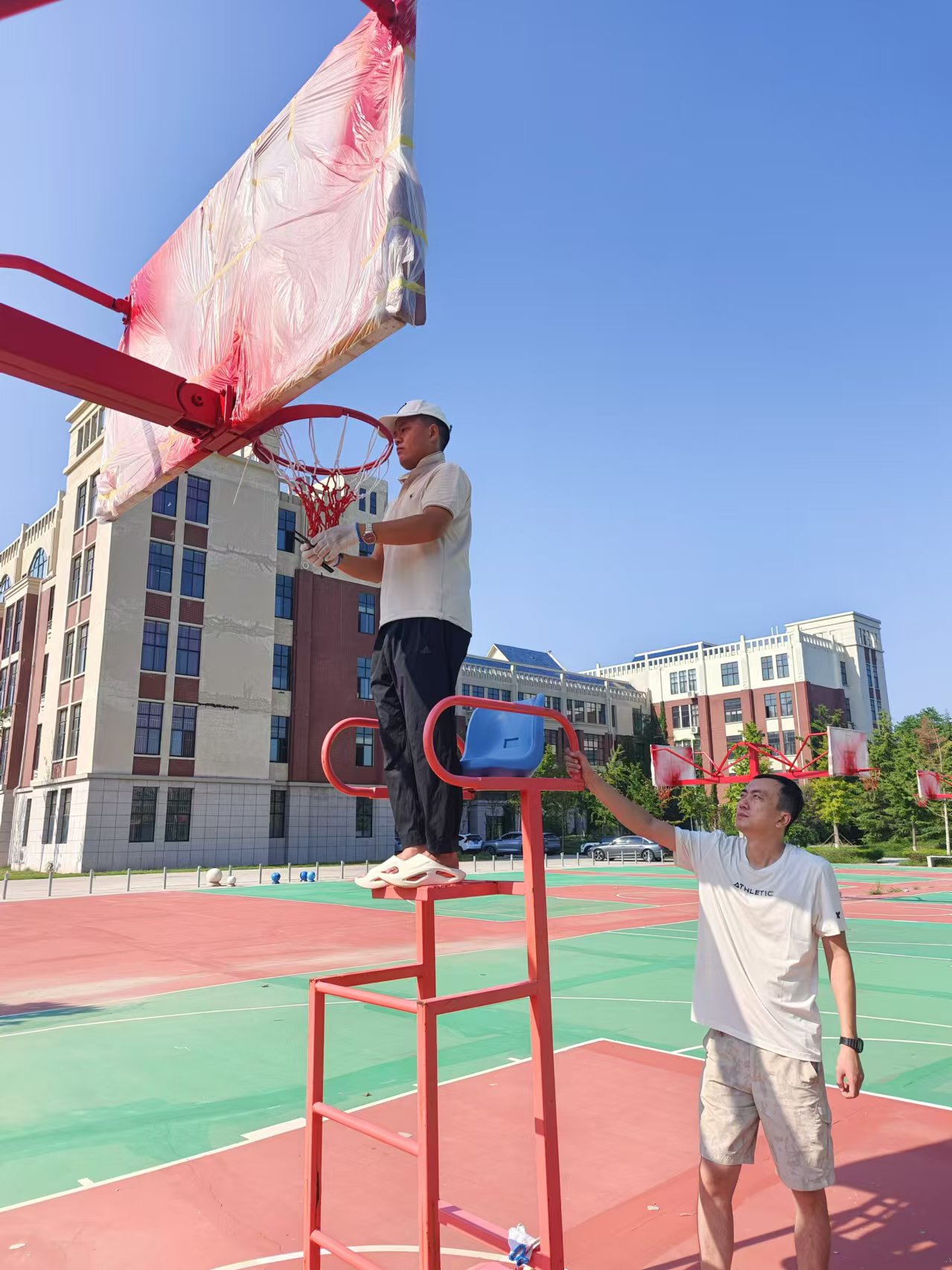 体育教师们对校内的体育设施及器材进行了逐一检查和维修,有的负责检查器材的损坏情况并进行分类和登记,有的负责清洁和保养,有的体育教师在操场安装篮球网,保障开学后教学工作有序开展。