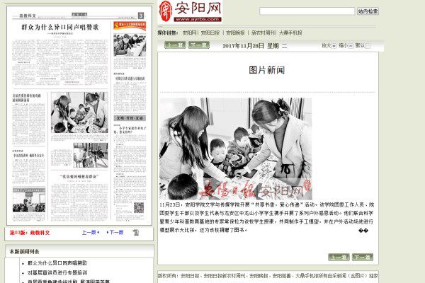 2017年11月28日,《安阳日报》、安阳网报道了文学与传媒学院以“共享书香 爱心传递”为主题的志愿活动。此项爱心传递活动是在团委书记靳琳静、思政辅导员刘林炜带领下于2017年11月23日在龙安区中龙山小学开展的。
