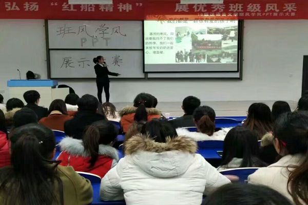 为深入学习宣传贯彻党的党的十九大精神,构建和谐美好校园,加强班风学风建设,2017年11月22日晚,文学与传媒学院2016级汉语言文学专业本科在阶梯教室五成功举办以“弘扬‘红船精神’展优秀班级风采”为主题的班风学风展示大赛。