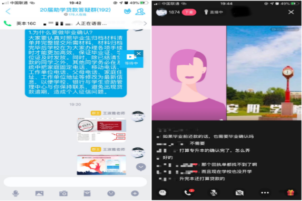 会上,王老师从“为什么要进行助学贷款毕业确认”“如何进行助学贷款毕业确认”“毕业离校前是否必须还清贷款”“如何提前还款”以及毕业生能够享受的各项优惠政策共五个方面为大家解答疑问。随后,王老师重点展示了通过支付宝进行还款的操作步骤,因疫情尚未结束王老师提倡大家尽量少去公共场所,如果需要到当地资助管理中心办理相关业务,则应提前预约,错峰出行。王老师强调,助学贷款与个人征信息息相关,一旦发生违约,就会对未来的工作和生活产生不良影响,提醒学生要及时登录助学贷款系统完善个人信息并完成毕业确认,毕业后一定要有计划地按时还款。她还鼓励大家关注参军入伍、“西部计划”、“三支一扶”等相关信息,积极回报祖国,投身到更需要我们的地方去。接着,李书记再次强调助学贷款毕业确认和按时偿还助学贷款的重要性,详细说明了有关毕业手续的办理流程,也表达了对同学们的关怀与感谢,希望大家心怀母校,努力开创美好的未来。同学们纷纷表示理解并支持学校的各项工作,也感谢老师们的辛勤付出。最后,李书记和王老师对同学们提出的问题进行细致解答。