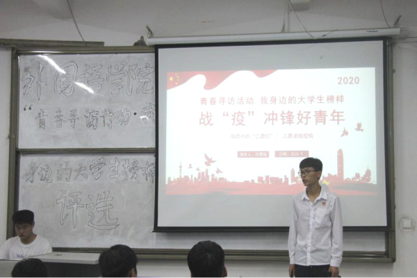 本次活动寻访类别包含战“疫”冲锋好青年、勤学上进好青年、志愿服务好青年、孝老爱亲好青年、德艺并进好青年、强身健体好青年六种类别。会议伊始,主持人简单地阐述了开展本次主题活动的目的和意义。随后,参赛选手依次上台进行PPT展示及事迹演讲,选手们极具感染力的自我介绍、才艺展示及个人优秀事迹讲述,现场气氛十分活跃。同学们纷纷表示要向榜样学习,不断提升专业知识和自身素养,争当学院文明代言人和传承者,做新时代有理想、有担当、有本领的新青年。最后,李书记做总结讲话,他肯定了此次活动的重要意义并对参赛选手赞扬,他强调:此次寻访活动旨在深入挖掘、宣身边人的优秀事迹,用“身边人”事迹进一步激发学生见贤思齐的内在动力,引导其在了解与学习中启发思想、鼓舞行动,给所有学生提供一个奋斗的参照,更好地激发同学们追求上进的积极性。